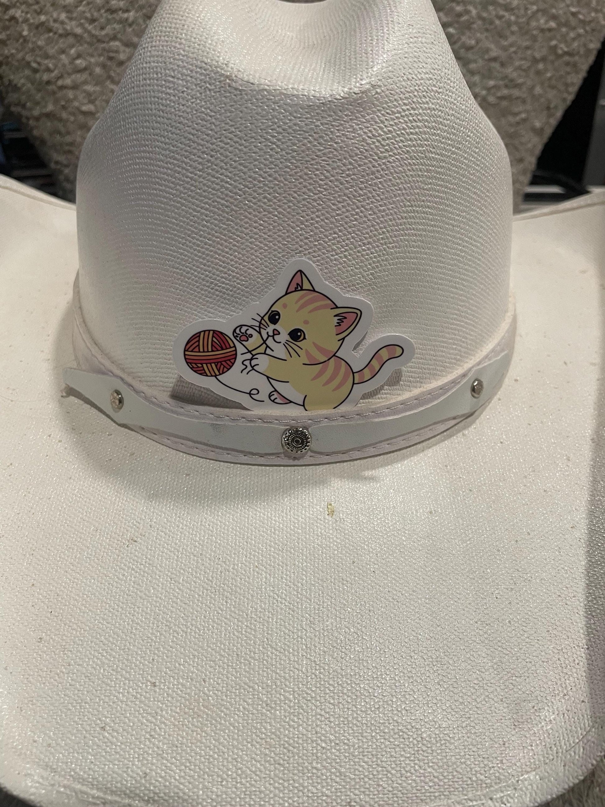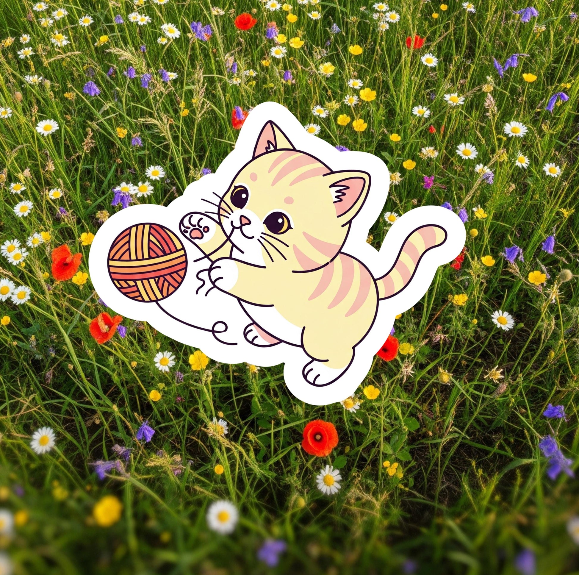 This adorable die-cut vinyl sticker features a super cute kitten tangled in a playful ball of yarn. With a sweet, mischievous expression, this sticker perfectly captures the irresistible charm of a cat at play. It‘s a delightful way to add a touch of whimsy and feline fun to your belongings.